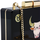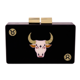 Handmade in Greece from durable plexiglass, this elegant box clutch is part of a new collection inspired by the signs of the zodiac. Gold-toned frame detailing against a deep black base creates a luxurious evening look, complete with an optional shoulder chain and shimmering Taurus design. (Height: 12.5cm, width: 18.5cm, depth: 5cm)