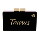 This double-sided Urania Gazelli clutch features a mosaic (marquetry) plexiglass with the Taurus zodiac sign on one side and name of the same suit on the opposite.