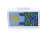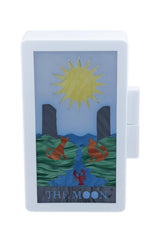 Handcrafted Urania Gazelli clutch is inlaid with plexiglas pieces - marquetry technique - with the Tarot Card "The Moon" hand drawn from original cards.