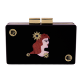This double-sided Urania Gazelli clutch features a mosaic (marquetry) plexiglass with the Virgo zodiac sign on one side and name of the same suit on the opposite.
