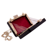 Handmade in Greece from durable plexiglass, this elegant box clutch is part of a new collection inspired by the signs of the zodiac. Gold-toned frame detailing against a deep black base creates a luxurious evening look, complete with an optional shoulder chain and shimmering Virgo design. (Height: 12.5cm, width: 18.5cm, depth: 5cm)